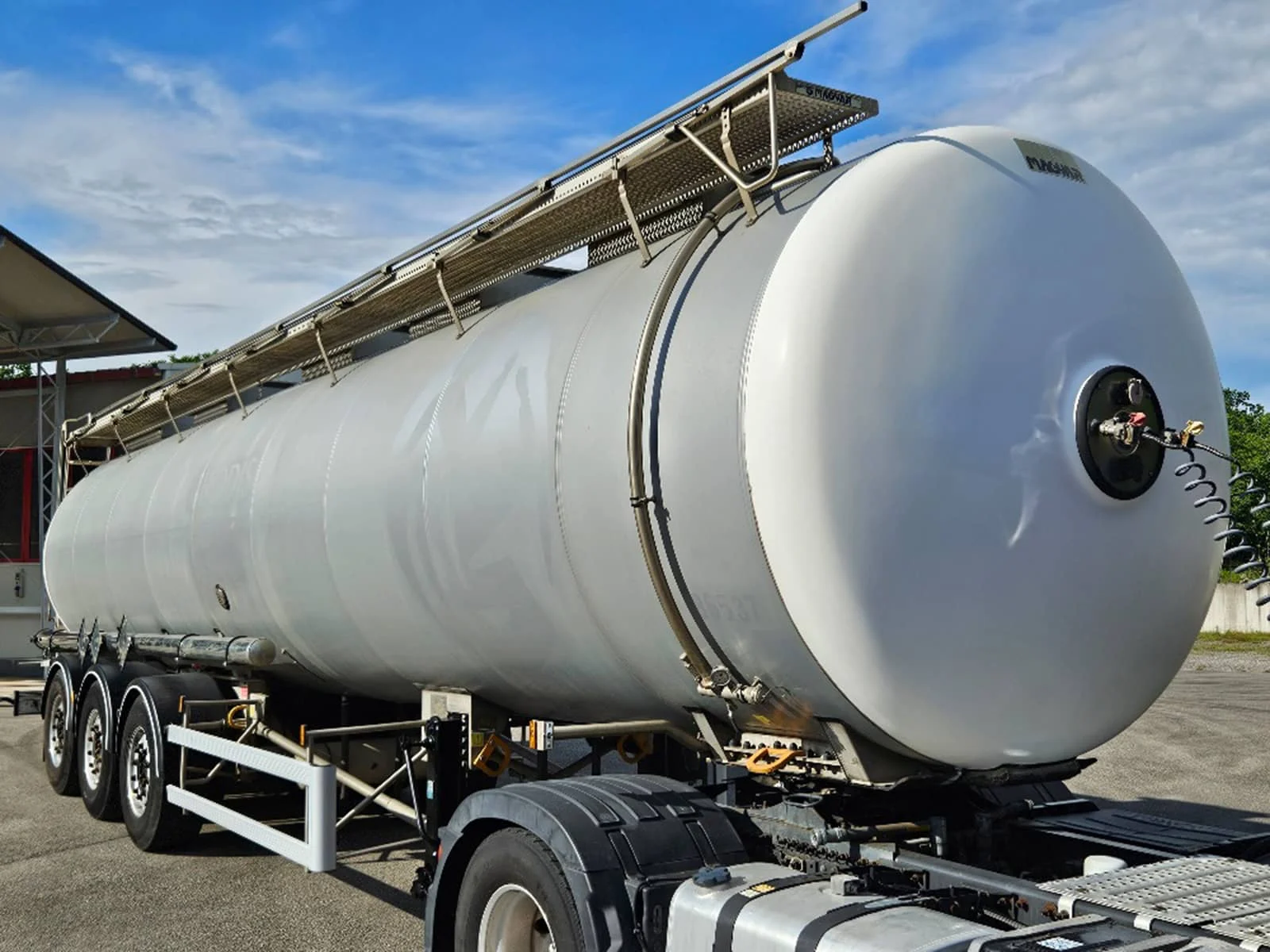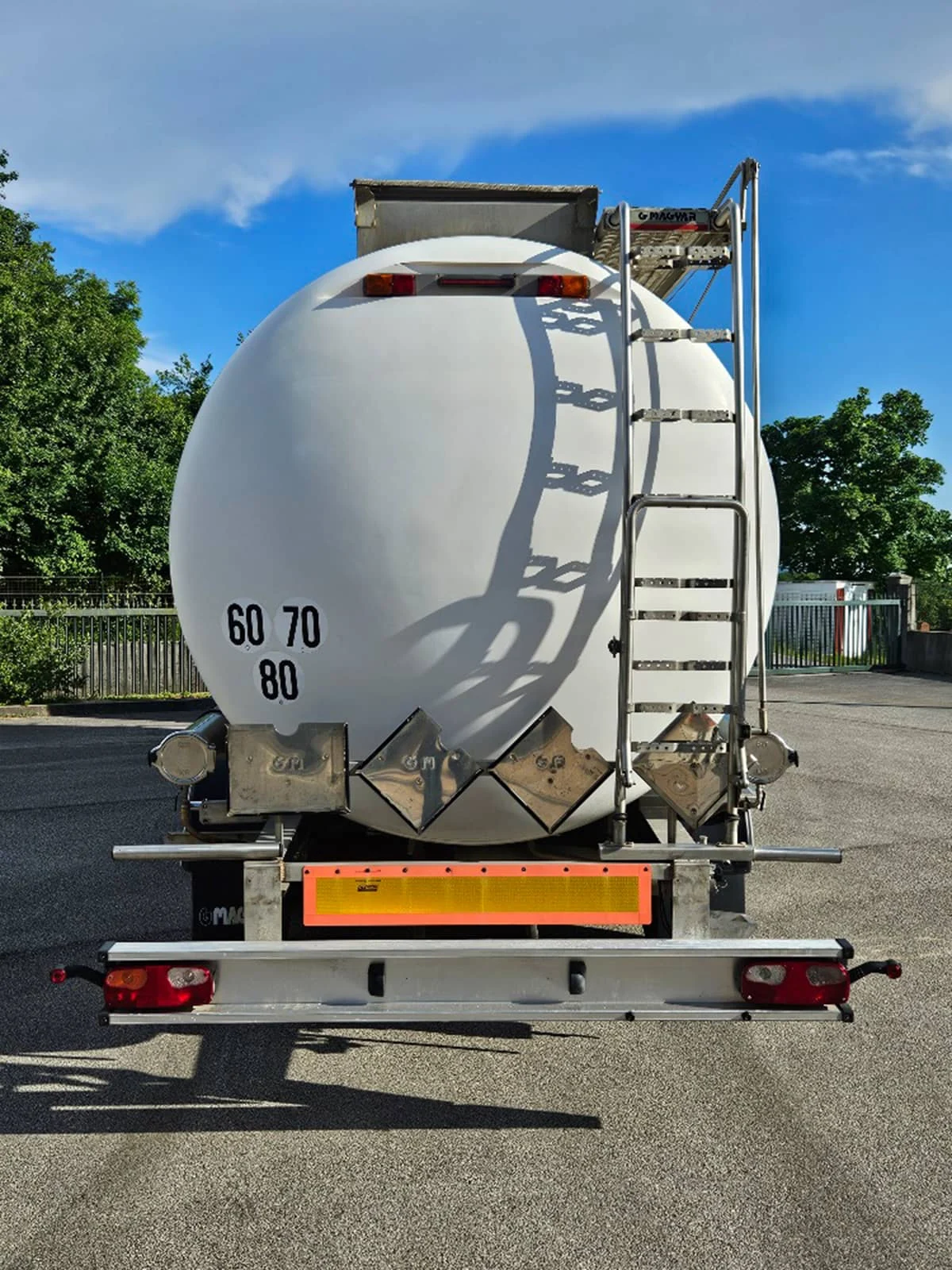 Poluprikolica cisterna Magyar za prijevoz kemikalija, ADR, code: L4BH, neto težina: 6.700 kg, 1 komora: 34.400 litara, 4 valobrana / 5 otvora, inox 316 L, probni tlak 4 bara, radni tlak 2 bara, izolirana, izolacijski lim PVDF-teflon, 3 osovine MB, disk kočnice, alu-felge, šasija od inoxa, kanali za grijanje robe na paru…